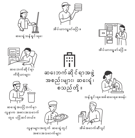 - ပြင်ပလူနာဆေးခန်း၊ ဆေးရုံခန်း၊ ခွဲစိတ်ခန်းနှင့် စာမေးပွဲခန်းများအတွက် ဧရိယာအလိုက် သန့်ရှင်းရေး